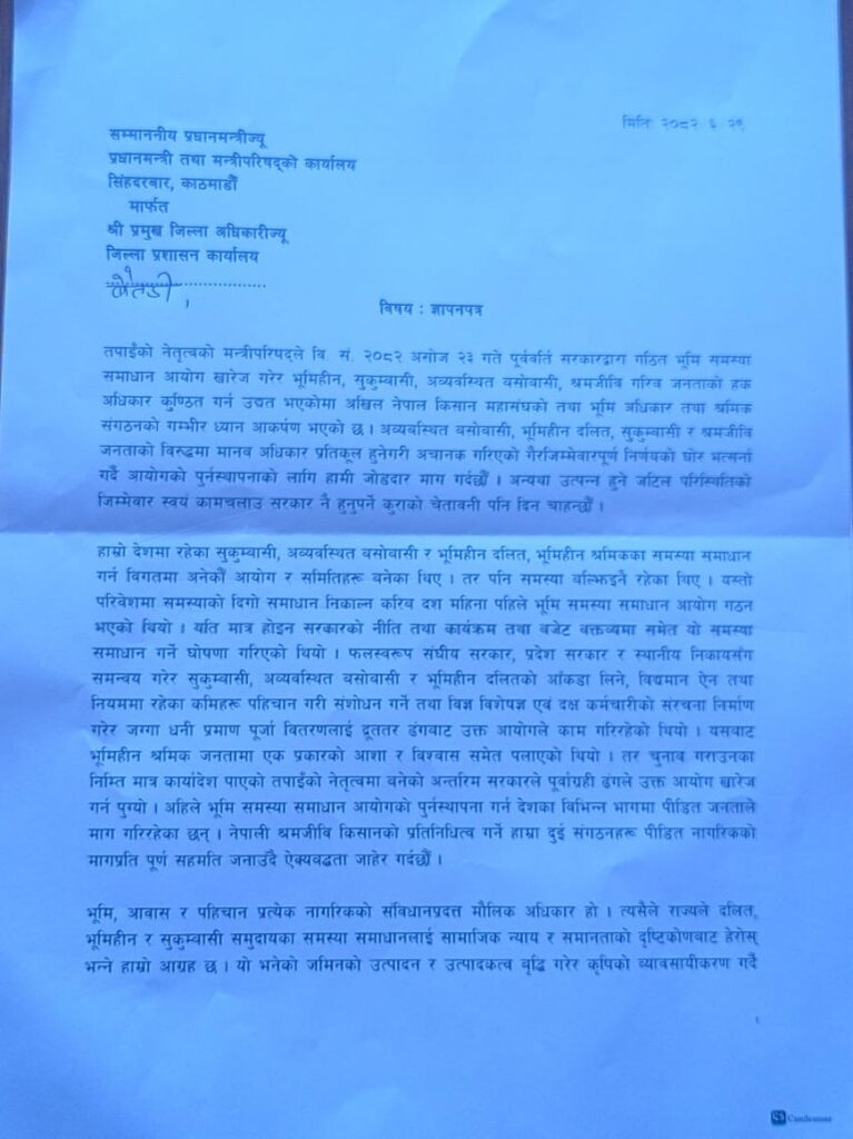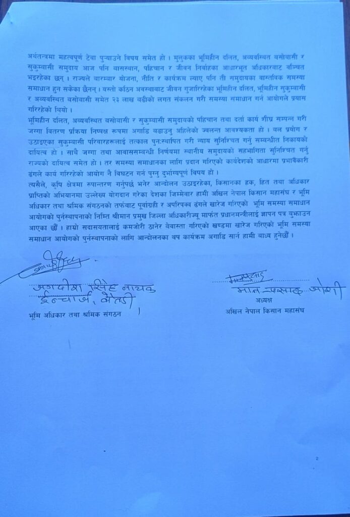 हालै सरकारले भूमि समस्या समाधान आयोग खारेज गर्ने निर्णय गरेको थियो । सरकारले गरेको उक्त निर्णय सच्याउन माग गर्दै ज्ञापनपत्र बुझाइएको भूमी अधिकार तथा श्रमिक संगठनका केन्द्रीय सदस्य एवं बैतडी इन्चार्ज जगदीशसिंह नायकले बताउनुभयो ।